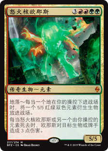 | Rules | Landfall — Whenever a land enters the battlefield under your control, create a 5/5 red and green Elemental creature token. Whenever Omnath, Locus of Rage or another Elemental you control dies, Omnath deals 3 damage to any target. |