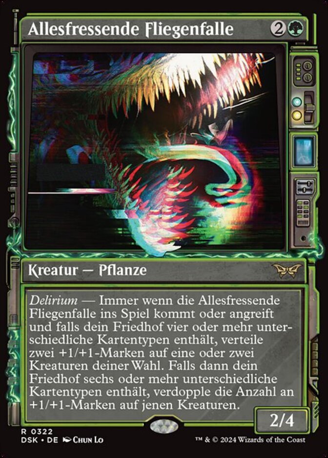 | Rules | Delirium — Whenever Omnivorous Flytrap enters or attacks, if there are four or more card types among cards in your graveyard, distribute two +1/+1 counters among one or two target creatures. Then if there are six or more card types among cards in your graveyard, double the number of +1/+1 counters on those creatures. |