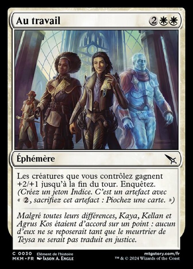 | Rules | Creatures you control get +2/+1 until end of turn. Investigate. (Create a Clue token. It's an artifact with ", Sacrifice this artifact: Draw a card.") |