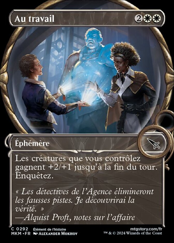 | Rules | Creatures you control get +2/+1 until end of turn. Investigate. (Create a Clue token. It's an artifact with ", Sacrifice this artifact: Draw a card.") |