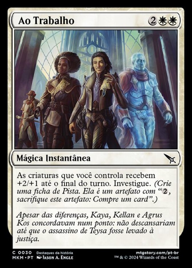 | Rules | Creatures you control get +2/+1 until end of turn. Investigate. (Create a Clue token. It's an artifact with ", Sacrifice this artifact: Draw a card.") |