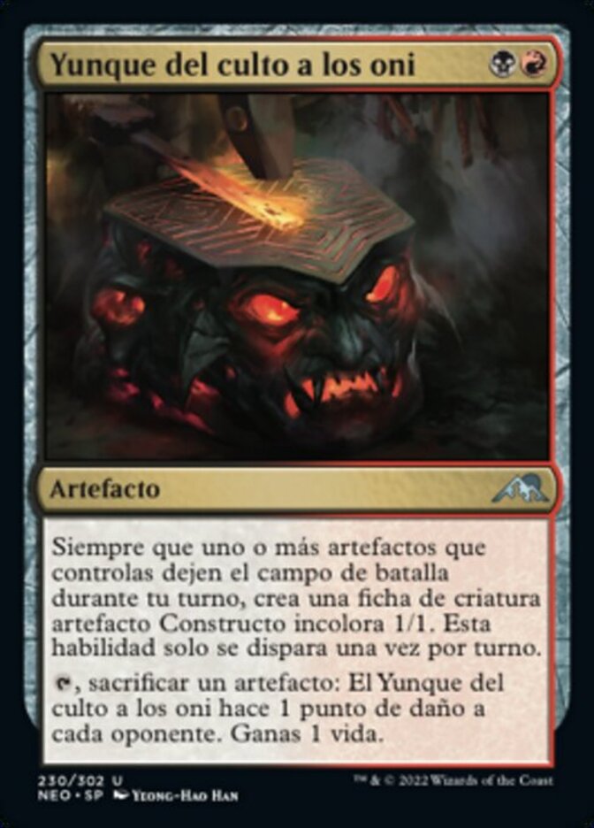 | Rules | Whenever one or more artifacts you control leave the battlefield during your turn, create a 1/1 colorless Construct artifact creature token. This ability triggers only once each turn. , Sacrifice an artifact: Oni-Cult Anvil deals 1 damage to each opponent. You gain 1 life. |