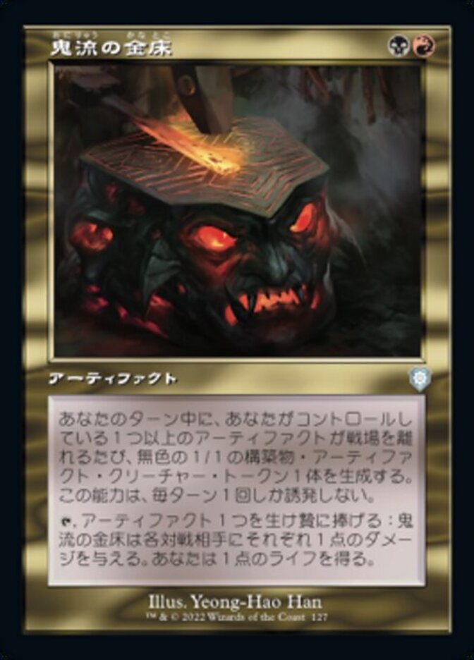 | Rules | Whenever one or more artifacts you control leave the battlefield during your turn, create a 1/1 colorless Construct artifact creature token. This ability triggers only once each turn. , Sacrifice an artifact: Oni-Cult Anvil deals 1 damage to each opponent. You gain 1 life. |