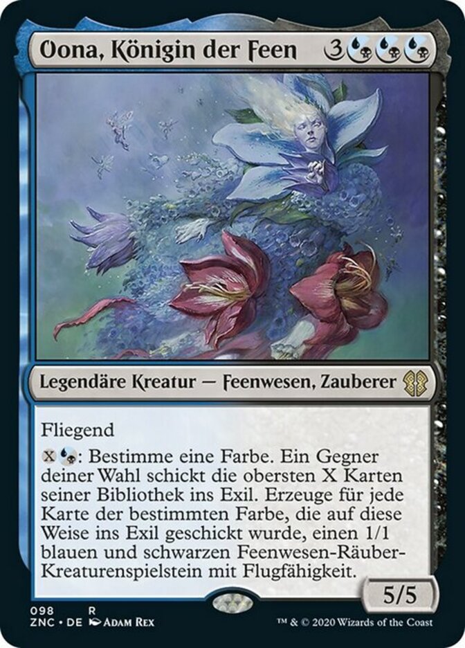 | Rules | Flying : Choose a color. Target opponent exiles the top X cards of their library. For each card of the chosen color exiled this way, create a 1/1 blue and black Faerie Rogue creature token with flying. |