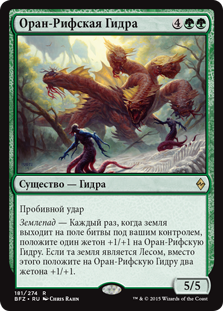 | Rules | Trample Landfall — Whenever a land enters the battlefield under your control, put a +1/+1 counter on Oran-Rief Hydra. If that land is a Forest, put two +1/+1 counters on Oran-Rief Hydra instead. |