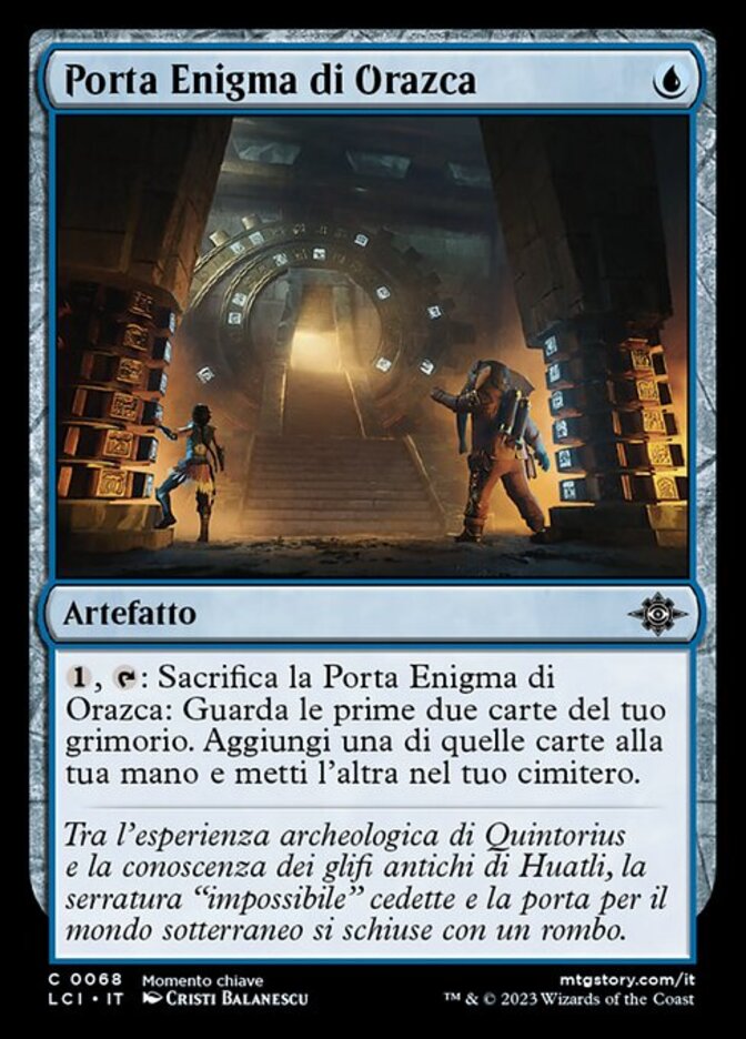 | Rules | , , Sacrifice Orazca Puzzle-Door: Look at the top two cards of your library. Put one of those cards into your hand and the other into your graveyard. |