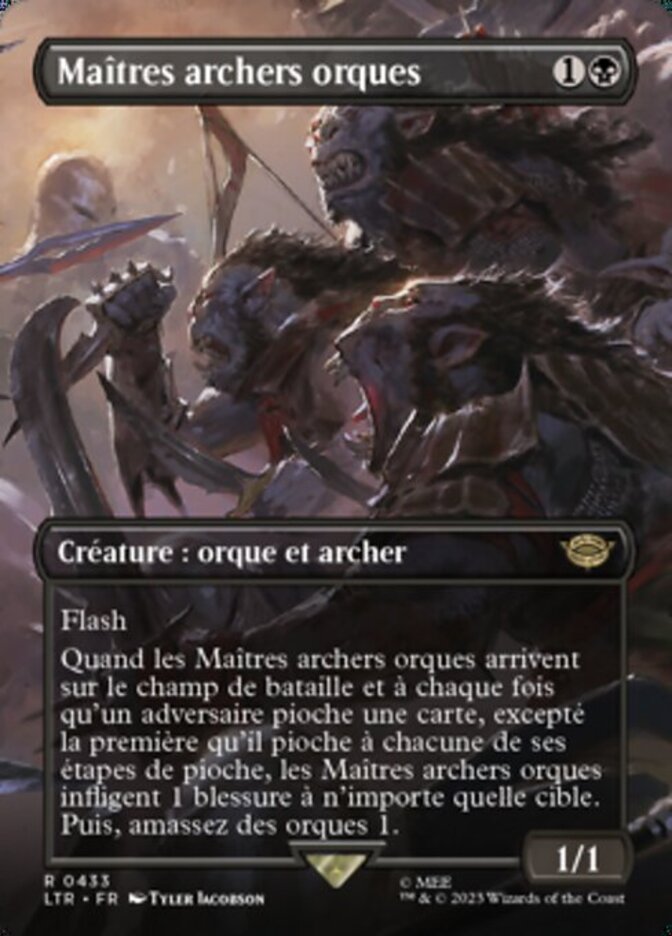 | Rules | Flash When Orcish Bowmasters enters the battlefield and whenever an opponent draws a card except the first one they draw in each of their draw steps, Orcish Bowmasters deals 1 damage to any target. Then amass Orcs 1. |