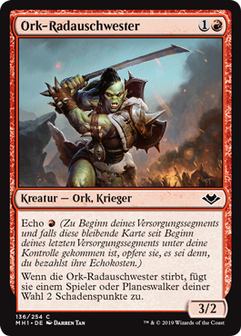 | Rules | Echo (At the beginning of your upkeep, if this came under your control since the beginning of your last upkeep, sacrifice it unless you pay its echo cost.) When Orcish Hellraiser dies, it deals 2 damage to target player or planeswalker. |