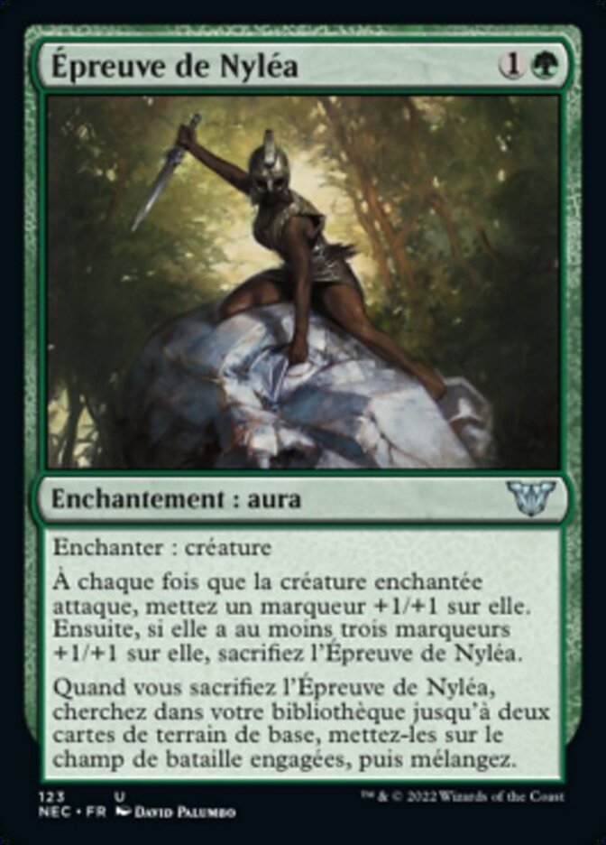 | Rules | Enchant creature Whenever enchanted creature attacks, put a +1/+1 counter on it. Then if it has three or more +1/+1 counters on it, sacrifice Ordeal of Nylea. When you sacrifice Ordeal of Nylea, search your library for up to two basic land cards, put them onto the battlefield tapped, then shuffle. |