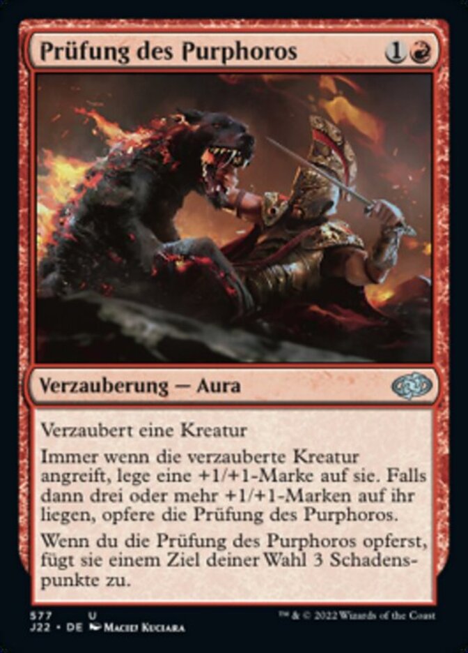 | Rules | Enchant creature Whenever enchanted creature attacks, put a +1/+1 counter on it. Then if it has three or more +1/+1 counters on it, sacrifice Ordeal of Purphoros. When you sacrifice Ordeal of Purphoros, it deals 3 damage to any target. |