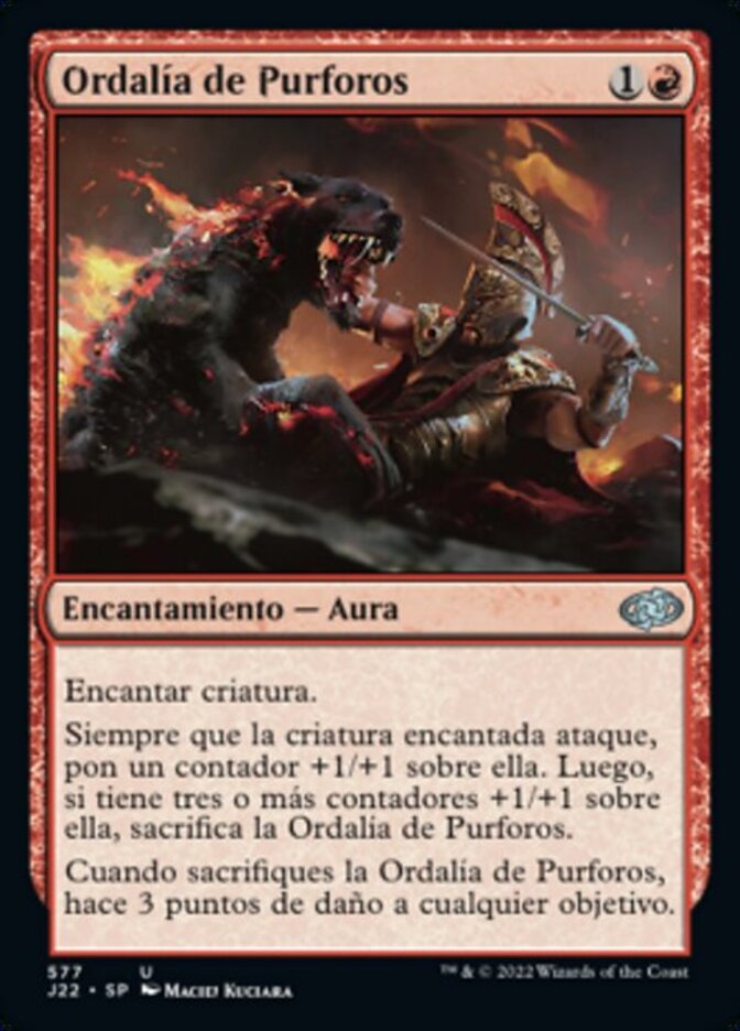 | Rules | Enchant creature Whenever enchanted creature attacks, put a +1/+1 counter on it. Then if it has three or more +1/+1 counters on it, sacrifice Ordeal of Purphoros. When you sacrifice Ordeal of Purphoros, it deals 3 damage to any target. |