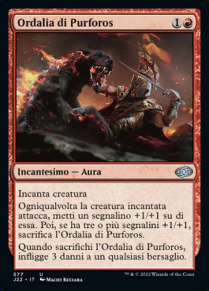 | Rules | Enchant creature Whenever enchanted creature attacks, put a +1/+1 counter on it. Then if it has three or more +1/+1 counters on it, sacrifice Ordeal of Purphoros. When you sacrifice Ordeal of Purphoros, it deals 3 damage to any target. |