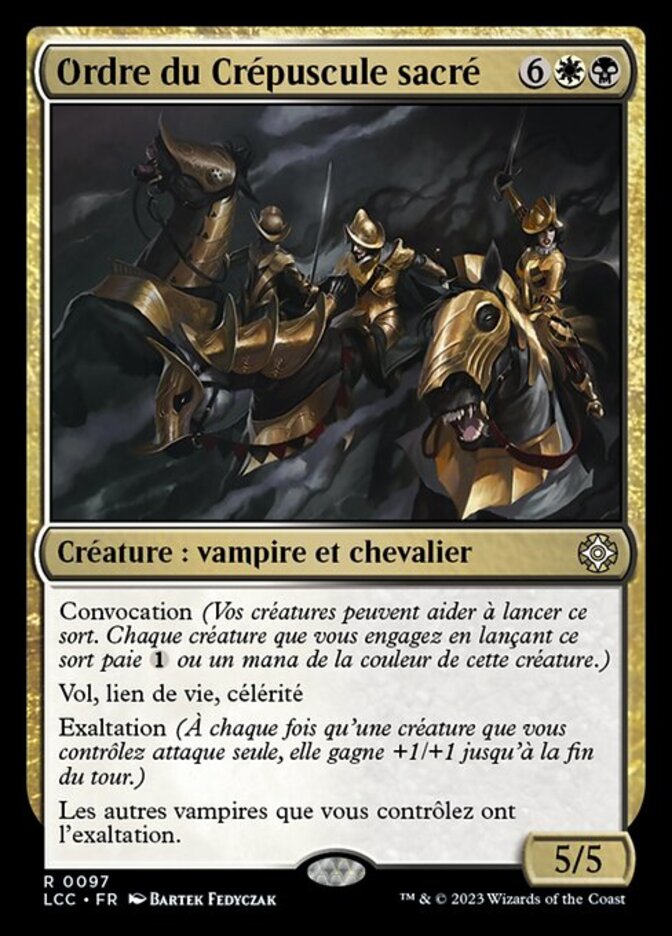 | Rules | Convoke (Your creatures can help cast this spell. Each creature you tap while casting this spell pays for or one mana of that creature's color.) Flying, lifelink, haste Exalted (Whenever a creature you control attacks alone, that creature gets +1/+1 until end of turn.) Other Vampires you control have exalted. |