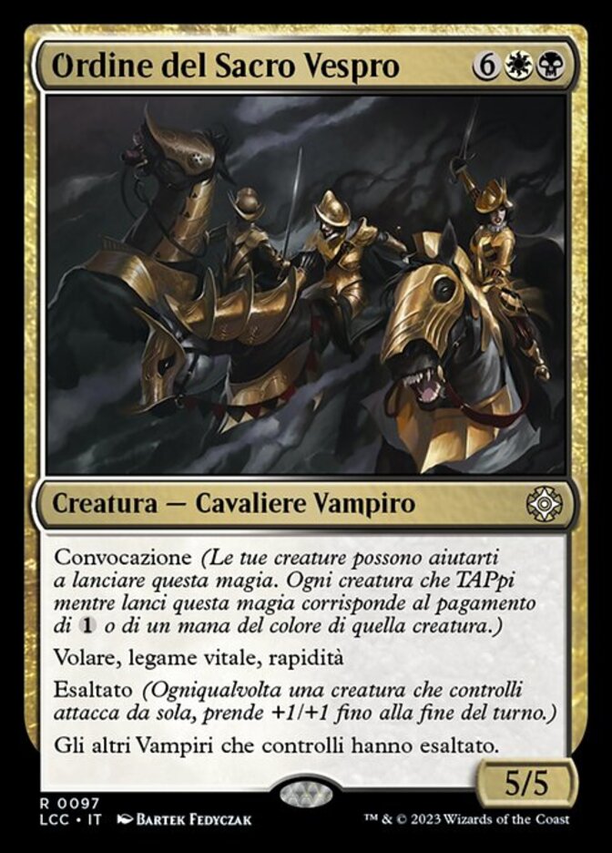| Rules | Convoke (Your creatures can help cast this spell. Each creature you tap while casting this spell pays for or one mana of that creature's color.) Flying, lifelink, haste Exalted (Whenever a creature you control attacks alone, that creature gets +1/+1 until end of turn.) Other Vampires you control have exalted. |