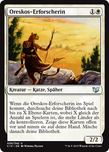 | Rules | When Oreskos Explorer enters the battlefield, search your library for up to X Plains cards, where X is the number of players who control more lands than you. Reveal those cards, put them into your hand, then shuffle. |