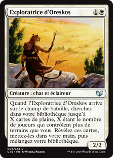 | Rules | When Oreskos Explorer enters the battlefield, search your library for up to X Plains cards, where X is the number of players who control more lands than you. Reveal those cards, put them into your hand, then shuffle. |