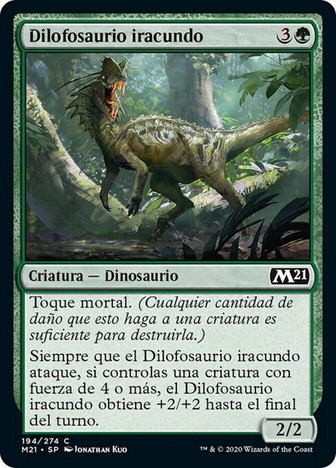 | Rules | Deathtouch (Any amount of damage this deals to a creature is enough to destroy it.) Whenever Ornery Dilophosaur attacks, if you control a creature with power 4 or greater, Ornery Dilophosaur gets +2/+2 until end of turn. |