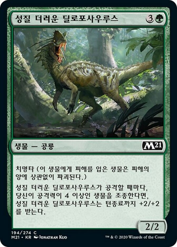 | Rules | Deathtouch (Any amount of damage this deals to a creature is enough to destroy it.) Whenever Ornery Dilophosaur attacks, if you control a creature with power 4 or greater, Ornery Dilophosaur gets +2/+2 until end of turn. |
