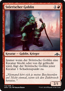 | Rules | Whenever Ornery Goblin blocks or becomes blocked by a creature, Ornery Goblin deals 1 damage to that creature. |