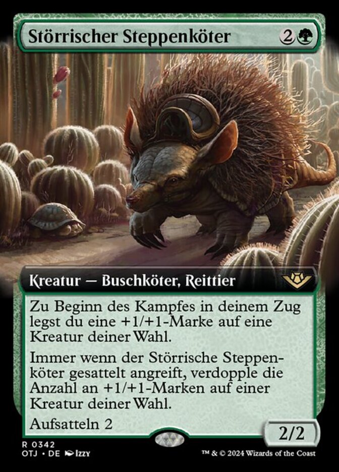 | Rules | At the beginning of combat on your turn, put a +1/+1 counter on target creature. Whenever Ornery Tumblewagg attacks while saddled, double the number of +1/+1 counters on target creature. Saddle 2 (Tap any number of other creatures you control with total power 2 or more: This Mount becomes saddled until end of turn. Saddle only as a sorcery.) |