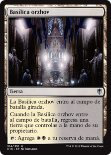 When Orzhov Basilica enters the battlefield, return a land you control to its owner's hand.