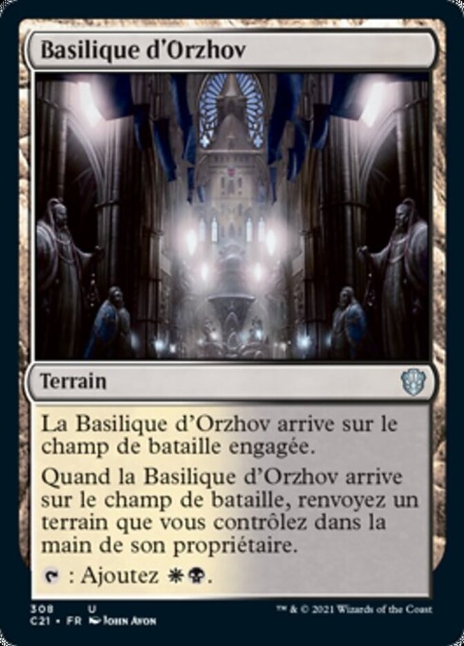 When Orzhov Basilica enters the battlefield, return a land you control to its owner's hand.