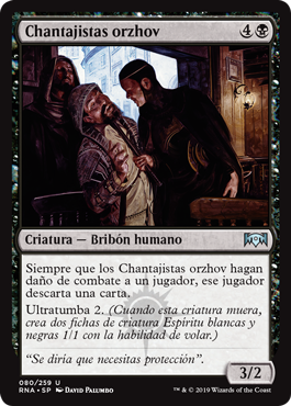 | Rules | Whenever Orzhov Racketeers deals combat damage to a player, that player discards a card. Afterlife 2 (When this creature dies, create two 1/1 white and black Spirit creature tokens with flying.) |