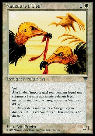| Rules | Flying At the beginning of each end step, if a creature died this turn, put a carrion counter on Osai Vultures. Remove two carrion counters from Osai Vultures: Osai Vultures gets +1/+1 until end of turn. |