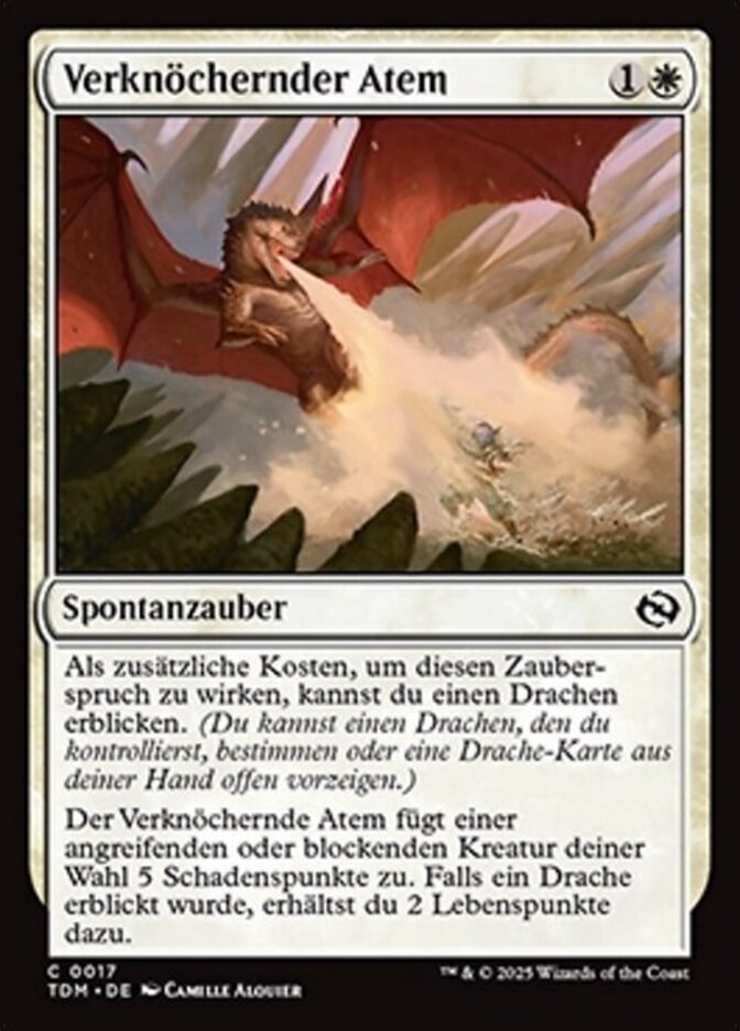 | Rules | As an additional cost to cast this spell, you may behold a Dragon. (You may choose a Dragon you control or reveal a Dragon card from your hand.) Osseous Exhale deals 5 damage to target attacking or blocking creature. If a Dragon was beheld, you gain 2 life. |