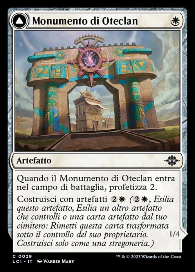 | Rules | When Oteclan Landmark enters the battlefield, scry 2. Craft with artifact (, Exile this artifact, Exile another artifact you control or an artifact card from your graveyard: Return this card transformed under its owner's control. Craft only as a sorcery.) // Flying Whenever Oteclan Levitator attacks, target attacking creature without flying gains flying until end of turn. |