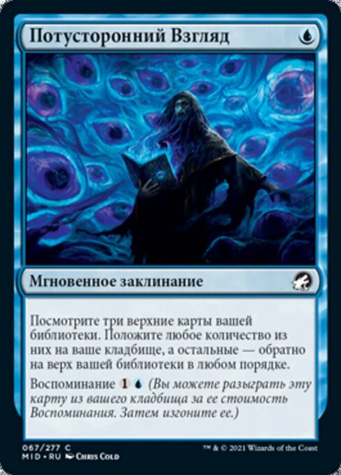 | Rules | Look at the top three cards of your library. Put any number of them into your graveyard and the rest back on top of your library in any order. Flashback (You may cast this card from your graveyard for its flashback cost. Then exile it.) |