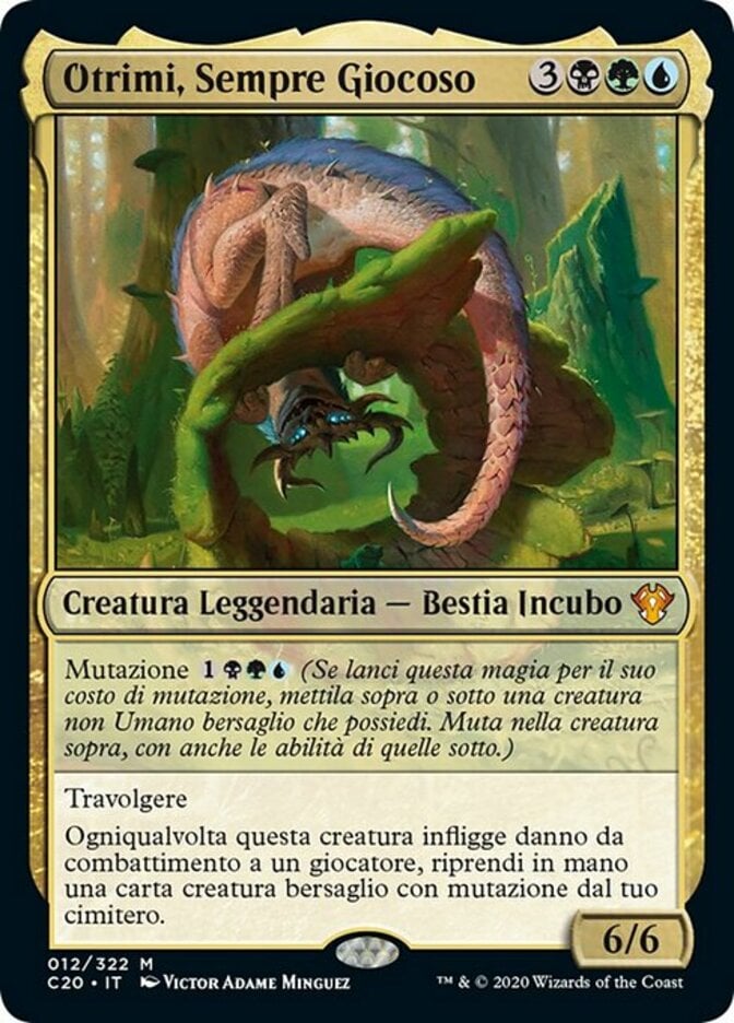 | Rules | Mutate (If you cast this spell for its mutate cost, put it over or under target non-Human creature you own. They mutate into the creature on top plus all abilities from under it.) Trample Whenever this creature deals combat damage to a player, return target creature card with mutate from your graveyard to your hand. |