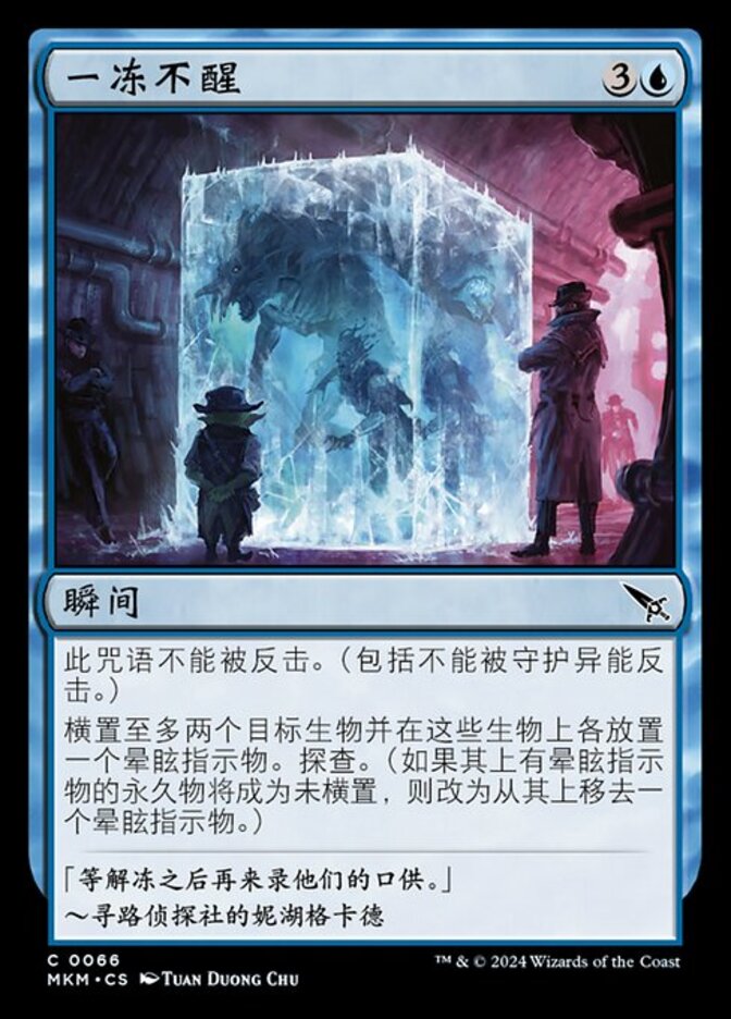 | Rules | This spell can't be countered. (This includes by the ward ability.) Tap up to two target creatures and put a stun counter on each of them. Investigate. (If a permanent with a stun counter would become untapped, remove one from it instead.) |