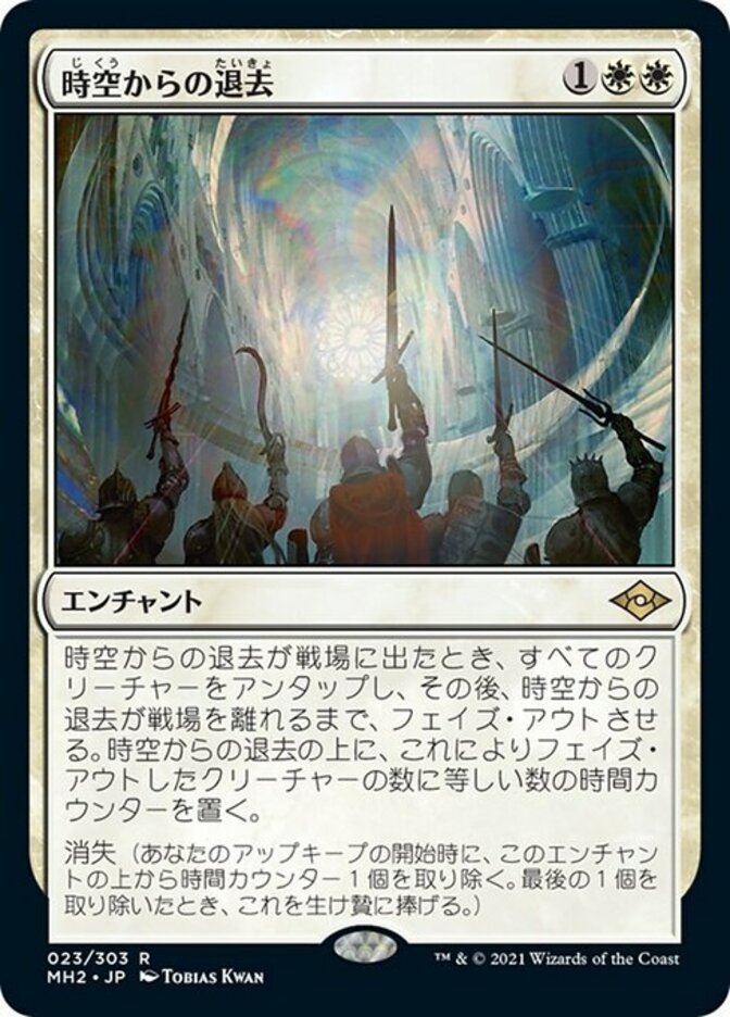 | Rules | When Out of Time enters the battlefield, untap all creatures, then phase them out until Out of Time leaves the battlefield. Put a time counter on Out of Time for each creature phased out this way. Vanishing (At the beginning of your upkeep, remove a time counter from this enchantment. When the last is removed, sacrifice it.) |