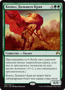 | Rules | Renown 6 (When this creature deals combat damage to a player, if it isn't renowned, put six +1/+1 counters on it and it becomes renowned.) Outland Colossus can't be blocked by more than one creature. |