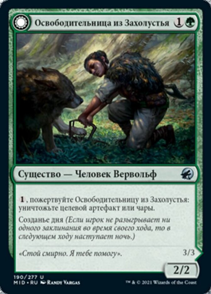 | Rules | , Sacrifice Outland Liberator: Destroy target artifact or enchantment. Daybound (If a player casts no spells during their own turn, it becomes night next turn.) // , Sacrifice Frenzied Trapbreaker: Destroy target artifact or enchantment. Whenever Frenzied Trapbreaker attacks, destroy target artifact or enchantment defending player controls. Nightbound (If a player casts at least two spells during their own turn, it becomes day next turn.) |