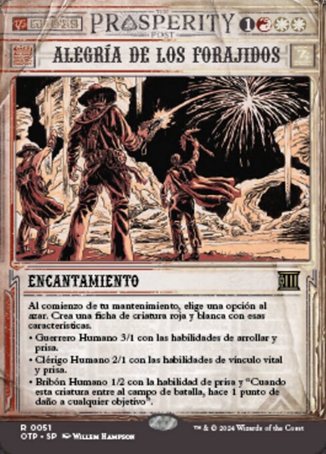 | Rules | At the beginning of your upkeep, choose one at random. Create a red and white creature token with those characteristics. • 3/1 Human Warrior with trample and haste. • 2/1 Human Cleric with lifelink and haste. • 1/2 Human Rogue with haste and "When this creature enters the battlefield, it deals 1 damage to any target." |