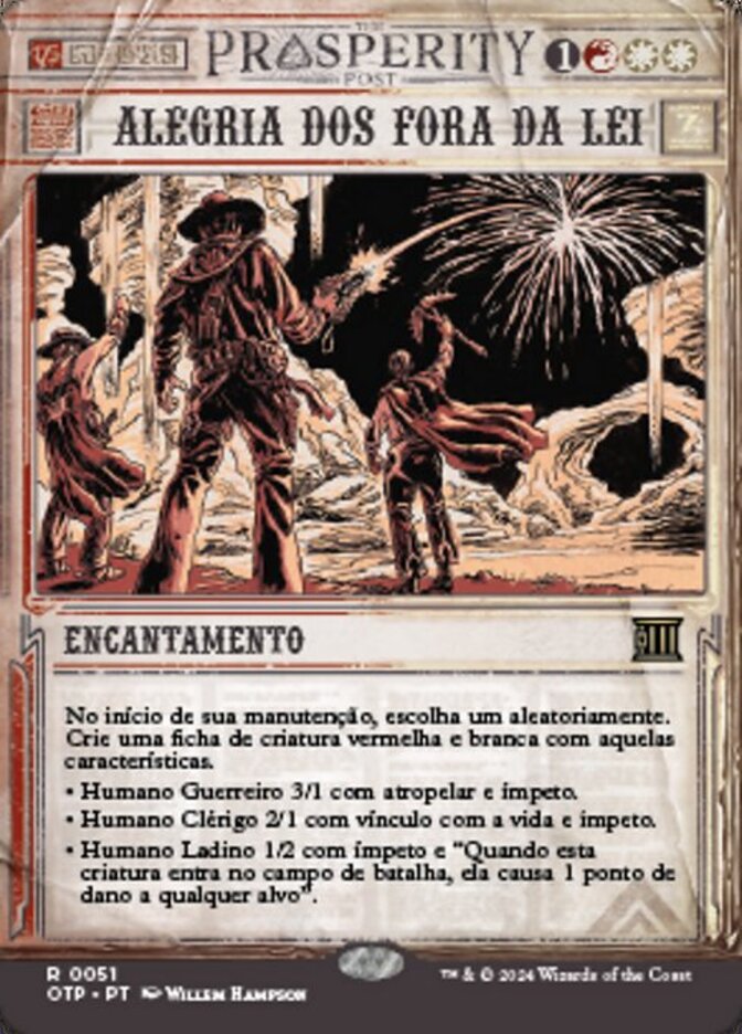 | Rules | At the beginning of your upkeep, choose one at random. Create a red and white creature token with those characteristics. • 3/1 Human Warrior with trample and haste. • 2/1 Human Cleric with lifelink and haste. • 1/2 Human Rogue with haste and "When this creature enters the battlefield, it deals 1 damage to any target." |