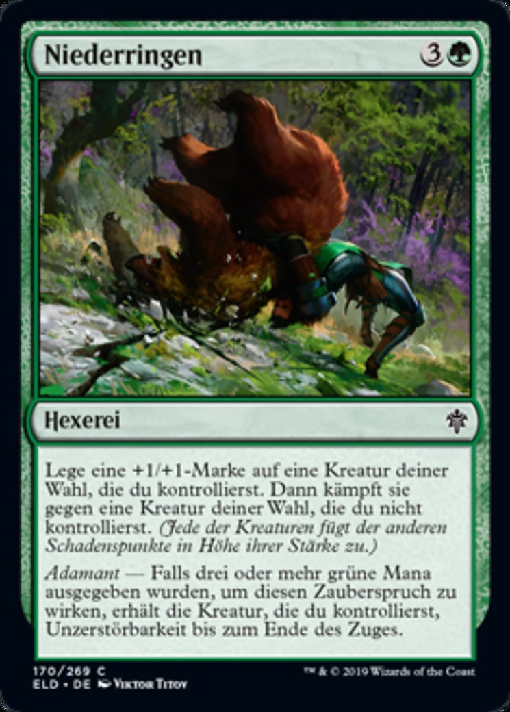 | Rules | Put a +1/+1 counter on target creature you control, then it fights target creature you don't control. (Each deals damage equal to its power to the other.) Adamant — If at least three green mana was spent to cast this spell, the creature you control gains indestructible until end of turn. |