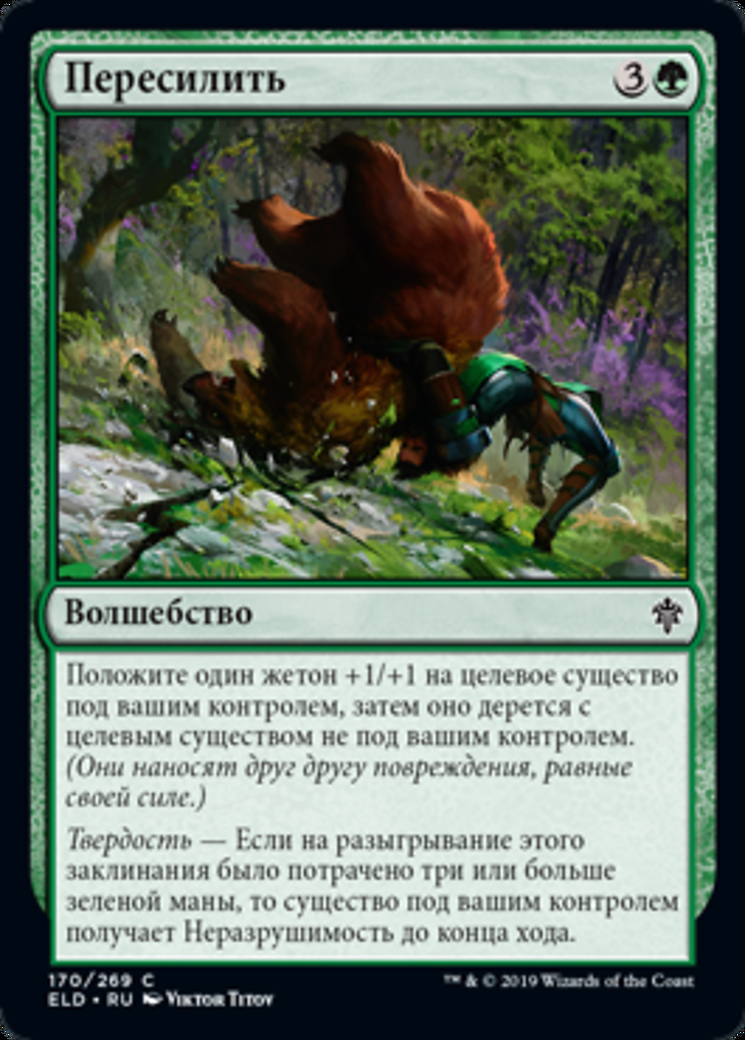 | Rules | Put a +1/+1 counter on target creature you control, then it fights target creature you don't control. (Each deals damage equal to its power to the other.) Adamant — If at least three green mana was spent to cast this spell, the creature you control gains indestructible until end of turn. |