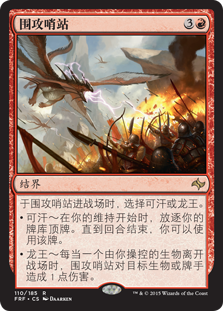 | Rules | As Outpost Siege enters the battlefield, choose Khans or Dragons. • Khans — At the beginning of your upkeep, exile the top card of your library. Until end of turn, you may play that card. • Dragons — Whenever a creature you control leaves the battlefield, Outpost Siege deals 1 damage to any target. |