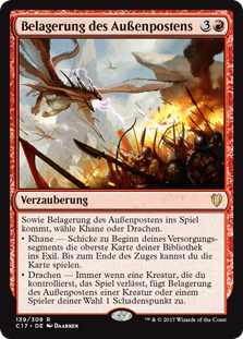 | Rules | As Outpost Siege enters the battlefield, choose Khans or Dragons. • Khans — At the beginning of your upkeep, exile the top card of your library. Until end of turn, you may play that card. • Dragons — Whenever a creature you control leaves the battlefield, Outpost Siege deals 1 damage to any target. |