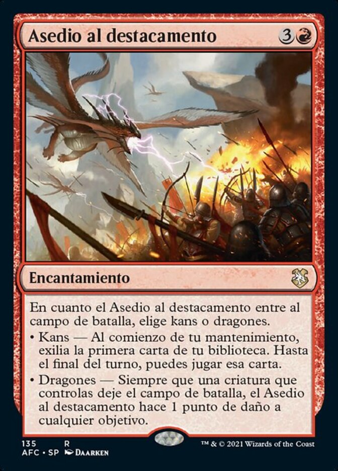 | Rules | As Outpost Siege enters the battlefield, choose Khans or Dragons. • Khans — At the beginning of your upkeep, exile the top card of your library. Until end of turn, you may play that card. • Dragons — Whenever a creature you control leaves the battlefield, Outpost Siege deals 1 damage to any target. |