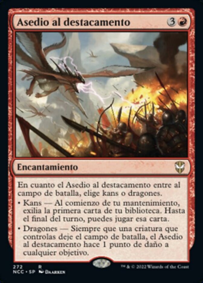 | Rules | As Outpost Siege enters the battlefield, choose Khans or Dragons. • Khans — At the beginning of your upkeep, exile the top card of your library. Until end of turn, you may play that card. • Dragons — Whenever a creature you control leaves the battlefield, Outpost Siege deals 1 damage to any target. |