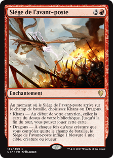 | Rules | As Outpost Siege enters the battlefield, choose Khans or Dragons. • Khans — At the beginning of your upkeep, exile the top card of your library. Until end of turn, you may play that card. • Dragons — Whenever a creature you control leaves the battlefield, Outpost Siege deals 1 damage to any target. |