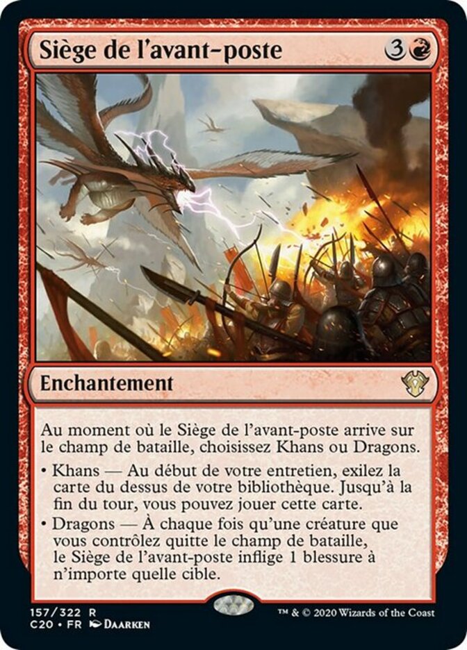 | Rules | As Outpost Siege enters the battlefield, choose Khans or Dragons. • Khans — At the beginning of your upkeep, exile the top card of your library. Until end of turn, you may play that card. • Dragons — Whenever a creature you control leaves the battlefield, Outpost Siege deals 1 damage to any target. |