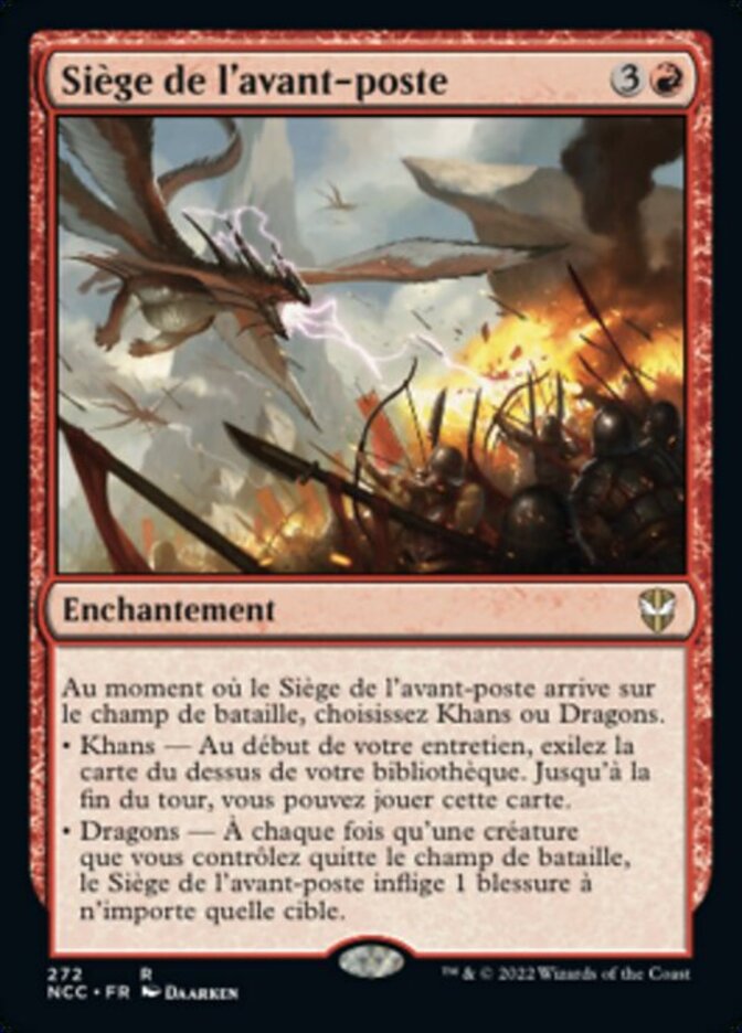 | Rules | As Outpost Siege enters the battlefield, choose Khans or Dragons. • Khans — At the beginning of your upkeep, exile the top card of your library. Until end of turn, you may play that card. • Dragons — Whenever a creature you control leaves the battlefield, Outpost Siege deals 1 damage to any target. |