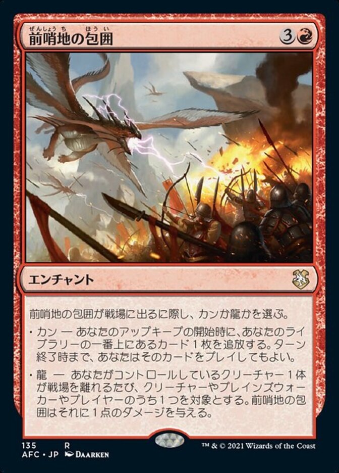 | Rules | As Outpost Siege enters the battlefield, choose Khans or Dragons. • Khans — At the beginning of your upkeep, exile the top card of your library. Until end of turn, you may play that card. • Dragons — Whenever a creature you control leaves the battlefield, Outpost Siege deals 1 damage to any target. |