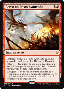 | Rules | As Outpost Siege enters the battlefield, choose Khans or Dragons. • Khans — At the beginning of your upkeep, exile the top card of your library. Until end of turn, you may play that card. • Dragons — Whenever a creature you control leaves the battlefield, Outpost Siege deals 1 damage to any target. |