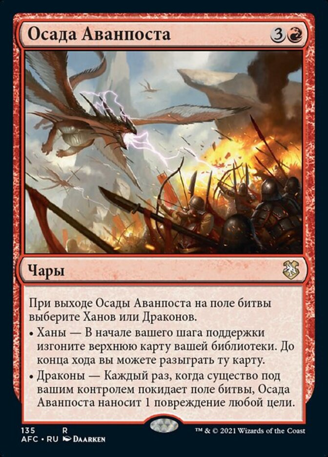 | Rules | As Outpost Siege enters the battlefield, choose Khans or Dragons. • Khans — At the beginning of your upkeep, exile the top card of your library. Until end of turn, you may play that card. • Dragons — Whenever a creature you control leaves the battlefield, Outpost Siege deals 1 damage to any target. |